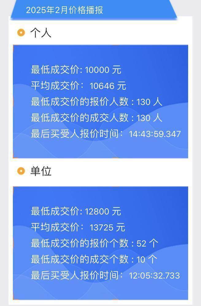 2月25日,2025年2月粤A车牌竞价结果出炉。本月个人最低成交价仍维持10000元。